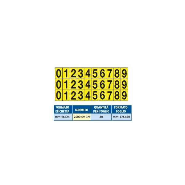 Le etichette adesive numeriche con sfondo giallo e scritta nera da 16x24 mm vengono fornite solitamente in confezioni da 5 FOGLI per numero.